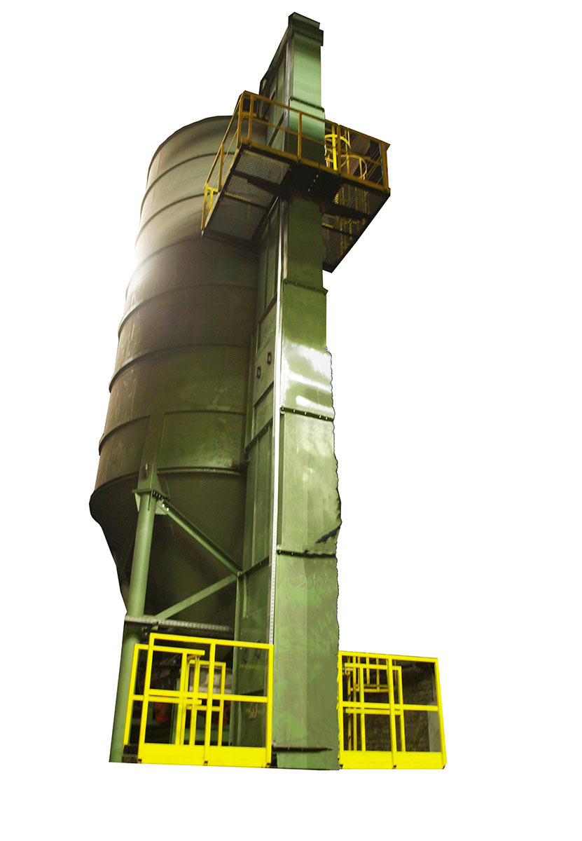 Bucket conveyors are designed for vertical transport of loose materials - from the lower level to the upper one - especially in foundries for the transport of molding materials. They are of the centrifugal type, with mid-deep and deep buckets. The pulling element is a band tie. Depending on the moisture content of the transferred molding materials in bucket conveyors, two types of buckets are used: for dry materials - ordinary buckets and for moist and wet materials - buckets with a movable bottom. The bucket conveyors have two types of drives: stationary and suspended. Depending on local conditions, each type of drive can be located on the right or left side of the conveyor.