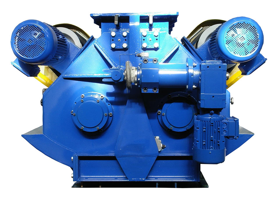 Crushing of the batch takes place between two rolls rotating with different peripheral speeds in opposite directions. The rolls are driven by motoreducers. The side surfaces of the rolls with thresholds welded on them constitute a standard work. At your request, we also produce plain-barrelled rolls or grooved ones. The rolls with individual drives are mounted on rockers. The pressure on the rolls is gravitational.